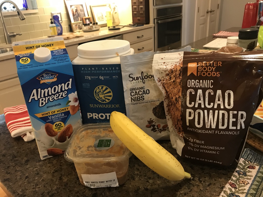 This is one of my favorite smoothies to make with 6 fresh ingredients. In searching for the cleanest protein packed with nutrients, look no further, try SUNWARRIOR plant-based Warrior Blend, Vanilla. One scoop of the vanilla protein adds a little sweetener with a ripe banana. I use one tablespoon of freshly ground honey roasted or regular peanut butter. Personally, I love the taste of Almond Breeze Vanilla almond milk with a hint of honey. The last two ingredients add one teaspoon of the elegance of chocolate taste with CACAO powder and Cacao nibs for crunch. And Ice cubes to blend and cool down the drink for a refreshing smoothie anytime of the day.